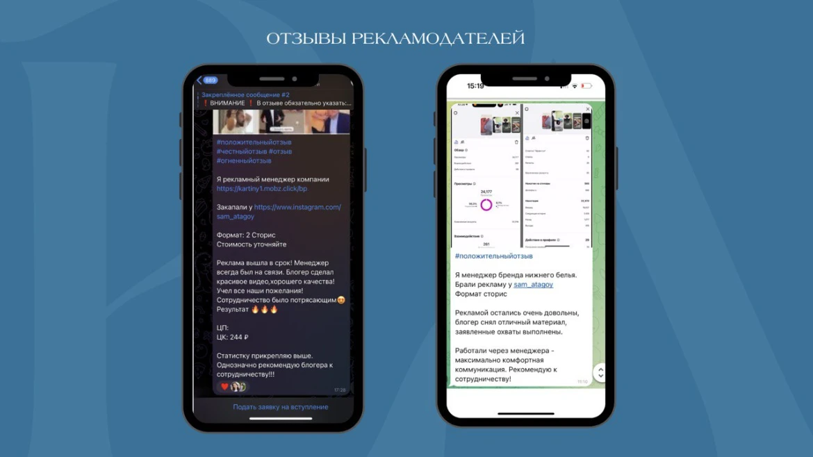 По этой причине крупные рекламодатели не рассматривали дорогостоящую рекламу (в рилс или в пакетном формате на нескольких площадках) в нашем блоге, просчитывая риски и не зная, какой отклик у аудитории последует.В идеале всегда необходимы расширенные отзывы с разнонишевых реклам с ЦК (ценой клика), ЦП (ценой подписчика) и числом продаж (если это было заявлено).
