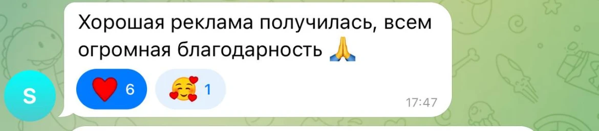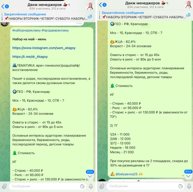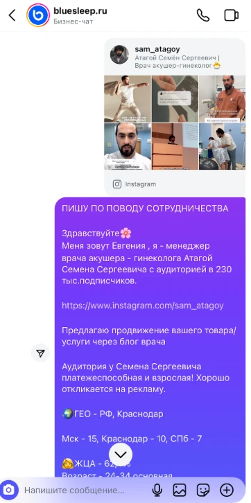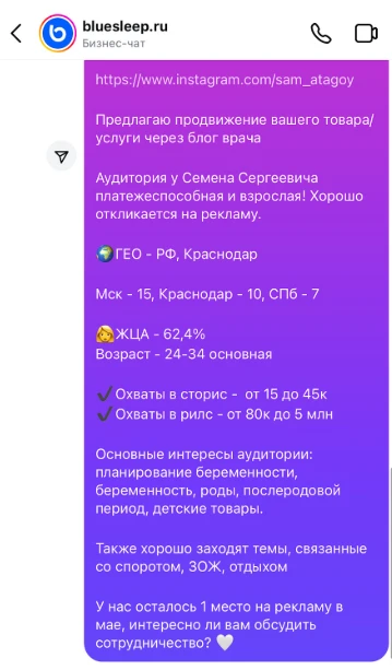 • составили скрипт сообщения для рекламодателей, который рассылали в Нельзяграме, Телеграме и закрытых чатах рекламодателей и менеджеров блогер