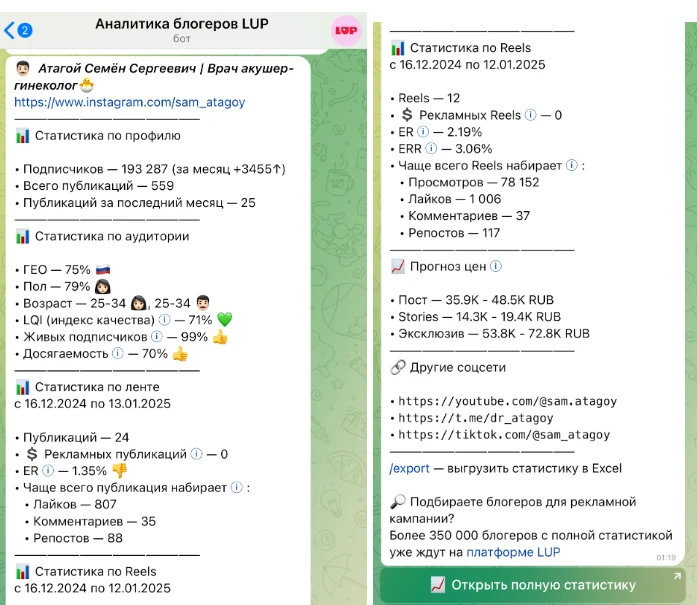 Поскольку наш блогер – эксперт, то стоимость рекламы мы оценивали из охватов в сторис и средних просмотров постов / рилс 2 к 1. Экспертные блоги могут ставить себе цену и 5 к 1, и 10 к 1.