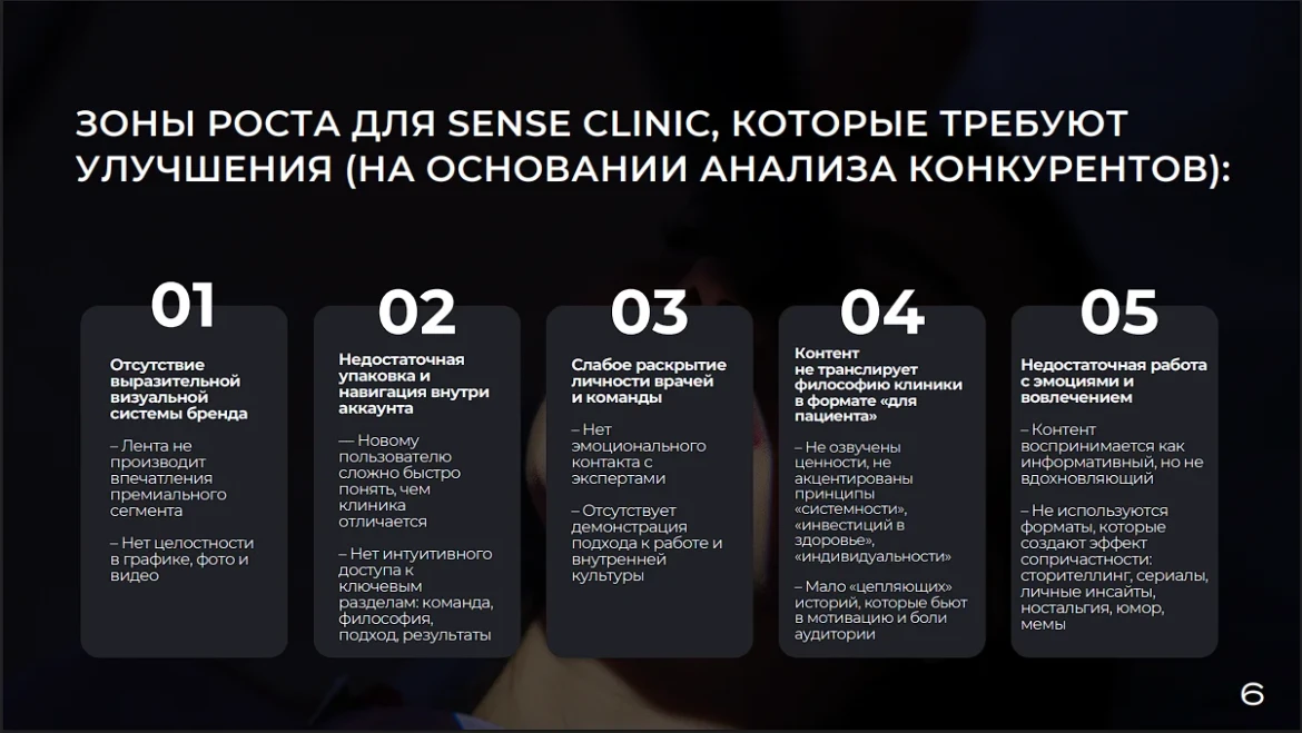 В первую очередь это глубокое знакомство с клиникой, продуктом, а также с целевой аудиторией. В этом нам очень помогли исследования, которые уже были у клиента. Объемные документы с подробным описанием портрета ЦА, УТП, позиционирования и многое другое. Скажем честно, такую информацию от клиента мы получали всего пару раз за все время существования агентства и восхищены подходом команды Sense Clinic.