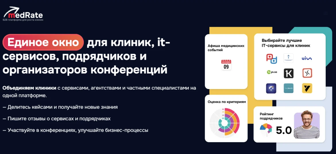 Друзья, вы знали, что есть специализированная платформа для клиник, it-сервисов, подрядчиков и организаторов медицинских мероприятий HTTPS://MEDRATE.RU? Мы уже разместились на данной платформе, где вы можете оставить отзывы о нашей работе, а также найти множество полезных кейсов и базу знаний по развитию клиник. Оставить отзыв о нашей компании вы можете по {ссылке}.